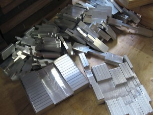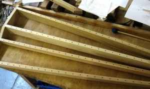 Some snapshots during construction of an instrument built to give new life to a salvaged keyboard. A frame was built to the correct geometry implied by the existing bars, and missing or damaged bars were replaced.